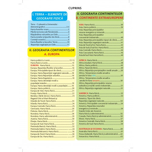 Acest atlas se adresează atât elevilor, studenţilor, profesorilor cât şi tuturor celor interesaţi să-şi însuşească cunoştinţe de geografie generală. Are în componenţă atât hărţile fizico-geografice ale continentelor, dar şi o serie de harţi tematice (harta climatică, harta vegetaţiei, profile fizico-geografice etc.), informaţii de geografie fizică şi umană în general. Este o lucrare de cultură generală necesară în orice bibliotecă.