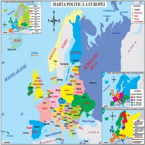 - harta politică a Europei (spate) - conţine şi câteva hărţi tematice: Harta Extensiunii Uniunii Europene; Harta Densităţii medii a populaţiei statelor; Harta Repartiţiei teritoriale a familiilor şi subfamiliilor lingvistice
