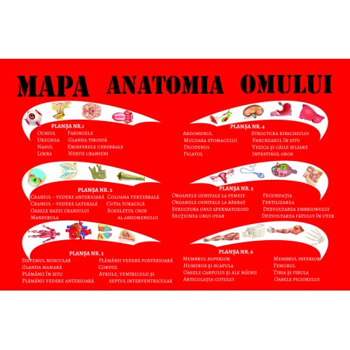 MAPA ANATOMIA OMULUI conține un set de 6 PLANȘE A3 pliate, plastifiate. Mapa este destinată elevilor, studenților și tuturor celor care doresc să cunoască complexitatea corpului uman.