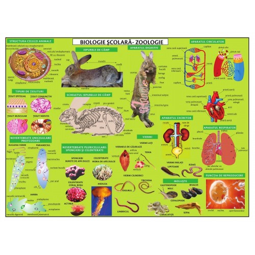 Cu ajutorul aceste planse, vei putea vizualiza cu usurinta structura celulei animale, aparatul digestiv al iepurelui, sau aparatul circulator, tipuri de tesuturi, dar si exemple de animale nevertebrate ( antropode, crustacee ori insecte), animale vertebrate ( pesti, amfibieni, reptile), pasari si mamifere ( mamifere inferioare, rozatoare, carnivore, omnivore, insectivore, ierbivore).